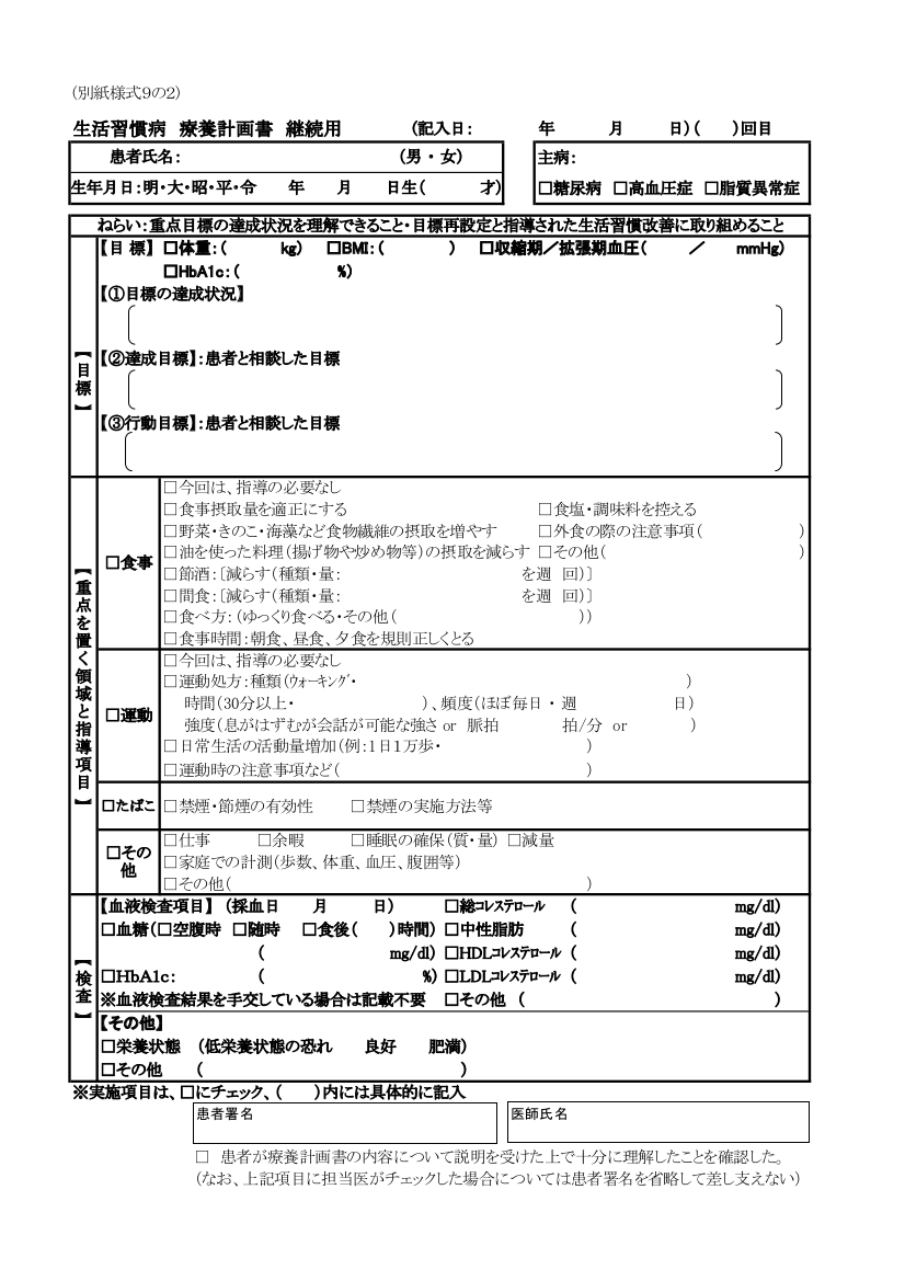 - 生活習慣病管理料(Ⅰ)を継続して算定する月においては、栄養、運動、休養、喫煙、家庭での体重や血圧の測定、飲酒に係る情報提供及びその他療養を行うに当たっての問題点等の生活習慣に関する総合的な治療管理に係る療養計画書(療養計画書の様式は、別紙様式9の2※3又はこれに準じた様式とする。)を交付するものとするが、当該療養計画書の内容に変更がない場合はこの限りでない。ただし、その場合においても、患者又はその家族等から求めがあった場合に交付するものとするとともに、概ね4月に1回以上は交付するものとする。なお、交付した当該療養計画書の写しは診療録に添付しておくものとする。また、血液検査結果を療養計画書と別に交付している場合又は患者の求めに応じて、電子カルテ情報共有サービスを活用して共有している場合であって、その旨を診療録に記載している場合は、療養計画書の血液検査項目についての記載を省略して差し支えない。