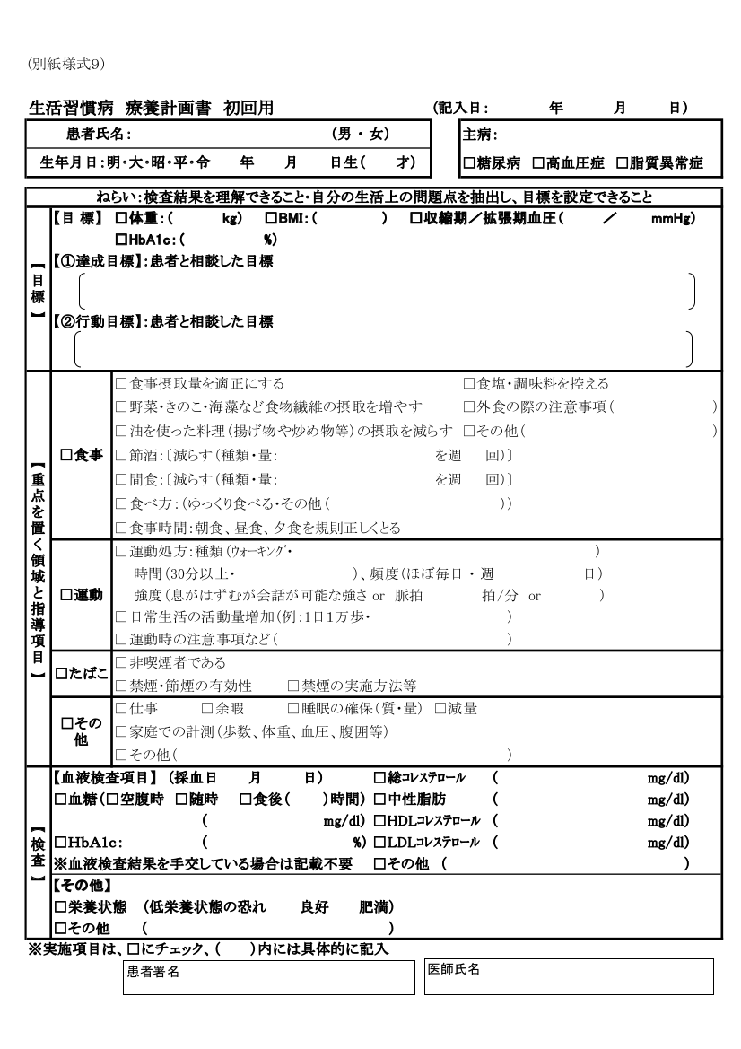 - 生活習慣病管理料(Ⅰ)は、栄養、運動、休養、喫煙、飲酒及び服薬等の生活習慣に関する総合的な治療管理を行う旨、患者に対して療養計画書(療養計画書の様式は、別紙様式9※2又はこれに準じた様式とする。以下同じ。)により丁寧に説明を行い、患者の同意を得るとともに、当該計画書に患者の署名を受けた場合に算定できるものである。また、交付した療養計画書の写しは診療録に添付しておくものとする。なお、療養計画書は、当該患者の治療管理において必要な項目のみを記載することで差し支えない。また、血液検査結果を療養計画書と別に交付している場合又は患者の求めに応じて、電子カルテ情報共有サービスを活用して共有している場合であって、その旨を診療録に記載している場合は、療養計画書の血液検査項目についての記載を省略して差し支えない。